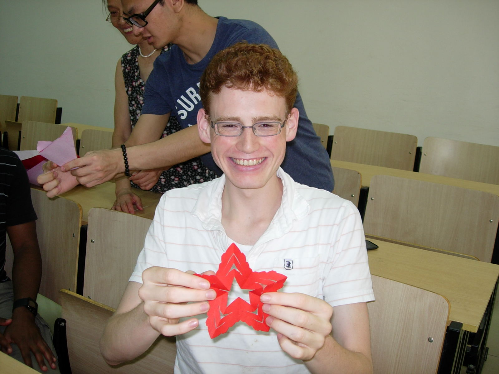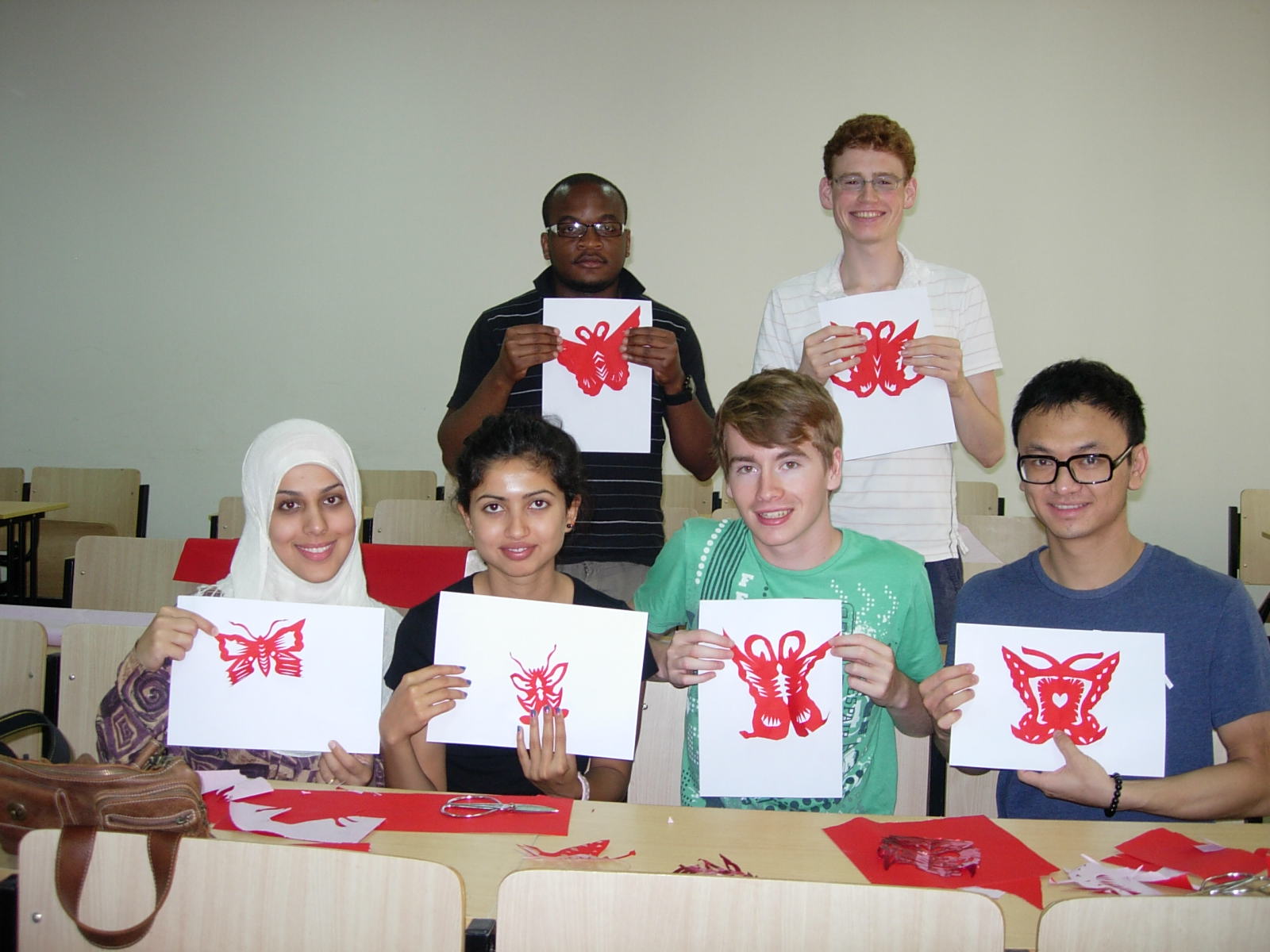 对于留学生们来说,这算是他们的剪纸处女秀,可是他们的作品频频给大家带来惊喜,来自英国爱丁堡大学的Browne亲吻自己剪出的蝴蝶,并激动的说“我要把她送给最心爱的人”,来自英国卡尔顿大学的Batoul在剪纸上显现出很高的悟性,她还在蝴蝶剪纸上加上了加拿大传统蝴蝶的元素,获得了大家的一致赞许。