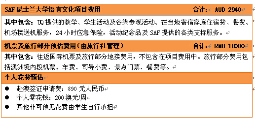 SAF必威BW基金会以NPO非营利机构性质为保证,以促进高校国际化的公益事业为使命,以让学生低价享受优质服务为原则,因此在组织该项目时,只收取成本服务费用。所有费用均以澳元计价并基于每14名学生选派一名带队老师的原则进行核算,2015年项目费用构成如下(注:2015年具体项目费用昆士兰大学还没有公布,以下费用是根据2014年项目预估的费用,2015年费用会略有浮动):
