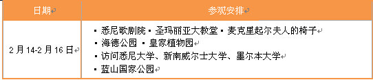 两周在UQ的课程结束后,学生将对悉尼进行游览。游览部分均由SAF的合作旅行社进行安排,费用不包括在项目费用里,行程概览如下: