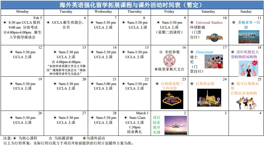 13:30-15:30 | 核心课程 (5选1) | 写作、口语、发现洛杉矶、校园探索、托福准备 |