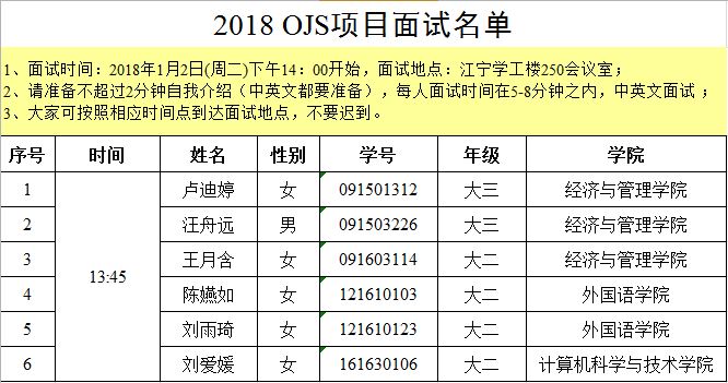 3、面试结果将在1月3日(周三)中午12:00前在国教院网站首页公告中公示,不再另行通知学生个人,请大家自己查看。面试通过的同学请务必加入OJS QQ群,群号:106867775,一定要以自己真实姓名加入,否则不予批准。加入成功以后,请务必把群名片改成2018+姓名+学校(国外学校还未确定,可暂时不写)。此外请公示名单上的同学尽快办理护照。