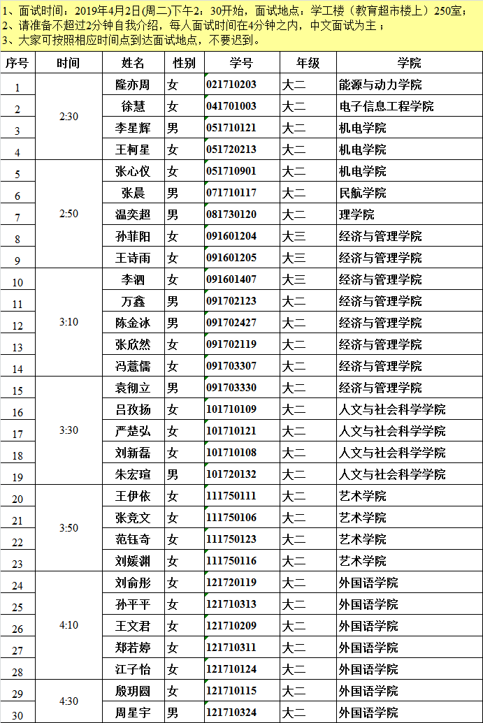 各位同学: 首先欢迎同学参加2019秋季学期台湾高校交流项目面试。面试选拔将本着“公平、公正、公开”的原则,主要考查学生GPA、综合素质等。面试具体通知如下: 1、请大家按照面试时间段(详见上表格)到达面试地点,不要迟到,等待面试过程中请保持安静。 2、请准备不超过2分钟自我介绍(中文),每个人面试时间大约控制在4分钟左右,面试提问以中文为主。 3、面试结果将在4月3日(周三)中午12:00前在国教院网站首页公告中公示,不再另行通知学生个人,请大家自己查看。面试通过的同学请务必加入对应项目的QQ群,一定要以自己真实姓名加入,否则不予批准。加入成功以后,请务必把群名片改成2019秋+姓名+专业。 清华 QQ群,群号:114694573 淡江 QQ群,群号:109919891 真理 QQ群,群号:302220235 台南 QQ群,群号:517381292 南台科技 QQ群,群号:662369761 2019秋季台湾项目队长群:645436310 4、每个出国项目尽快选派一名队长和樊宣老师对接,请有意向当队长的同学在QQ群中给樊宣老师留言,希望担任队长的同学能够认真负责,性格开朗,乐于助人。请各项目队长以真实姓名申请加入2019秋台湾项目队长群:群号待通知,加入成功以后,修改群名片:姓名+选派学校。 5、凡是面试选拔上的同学,如有特殊情况放弃机会,请在公示出来24小时之内主动联系樊宣老师申请退出,否则以后不得再参加南航国际交流项目的选拔,已经录取的学生不得参加其他台湾项目面试。 6、在考虑专业课程对应的情况下,每个同学可以申报3个志愿,面试按照志愿顺序依次录取。 7、请仔细阅读《南航赴国(境)外交流学习学生必读》 8、南航各类国际教育项目信息发布官方平台: 1)、BW·西汉姆联网站http:/留学海外/信息发布 2)、南航国际教育微信公众号:南航国际教育在线