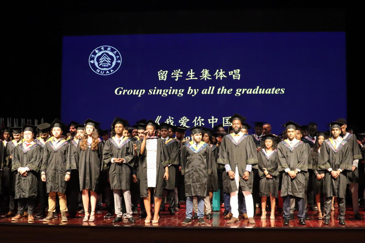 聂宏持权杖带领嘉宾入场,拉开了毕业典礼的帷幕。留学生集体深情演唱《我爱你中国》后,典礼正式开始。全场奏唱南航校歌,勾起了毕业生们对南航深深的不舍与留恋。随后,由留学生亲自制作的毕业视频更是将现场的气氛推到了高潮,时光荏苒,四年的时光一闪而过,转眼就到了毕业的这一天,四年的南航生活,伴随着欢笑和泪水。