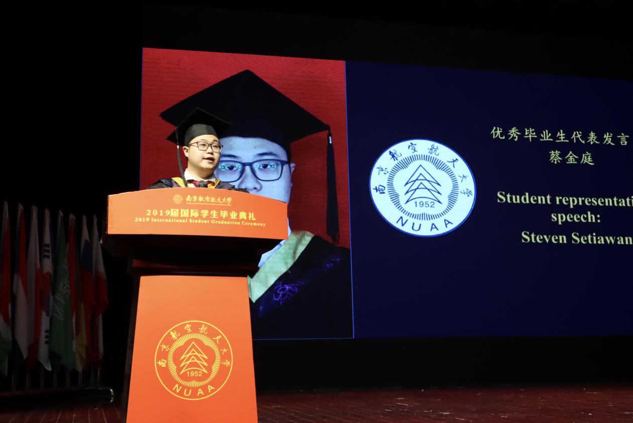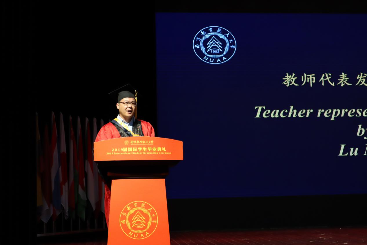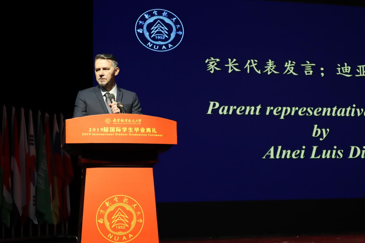 毕业生代表、家长代表和教师代表分别发言。来自印度尼西亚的毕业生代表蔡金庭表达了自己对南航、对老师和对同学的不舍,来自巴西的留学生家长代表Alnei Luis Dias表达了对南航以及对老师们的感激,教师代表卢敏表达了对毕业生未来的祝福和期望。四年的点点滴滴,尽在字里行间,希望即将踏入社会的毕业生能怀抱梦想,扛起责任,脚踏实地,朝着梦想持之以恒地努力。