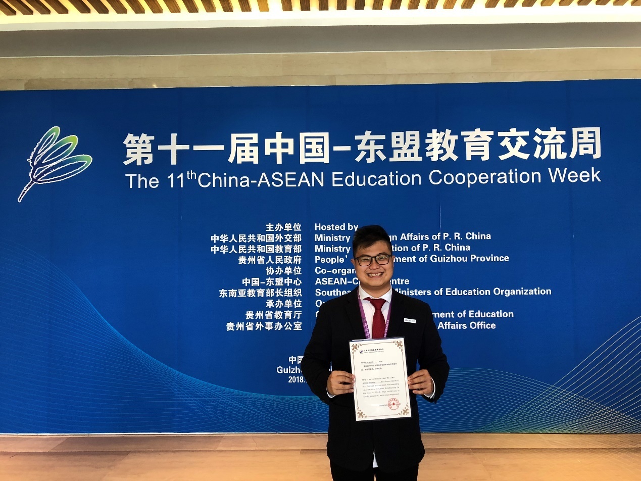 7月26日,我校2015级印度尼西亚籍留学生Steven Setiawan从全国众多获得中国政府奖学金的留学生中脱颖而出,成功获选为获奖学生代表,受邀参加第十一届中国-东盟教育交流周活动。中国教育部副部长田学军和泰王国教育部副部长索蓬∙纳帕通向Steven Setiawan等6名来自东盟的优秀在华自费留学生颁发“中国政府优秀来华留学生奖学金”证书。