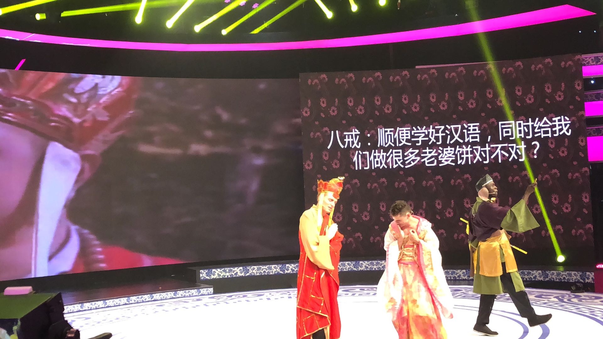 本次比赛,不仅包括个人演讲环节,而且增加了“汉语我来猜”和“汉语我来演”两个团队比赛项目。赫姆斯和其他三位来自南京赛区的选手配合默契,表现出色,在两个团队赛中均获得最高分。在团队赛“汉语我来演”中,赫姆斯扮演的八戒表现生动,赢得现场阵阵掌声。