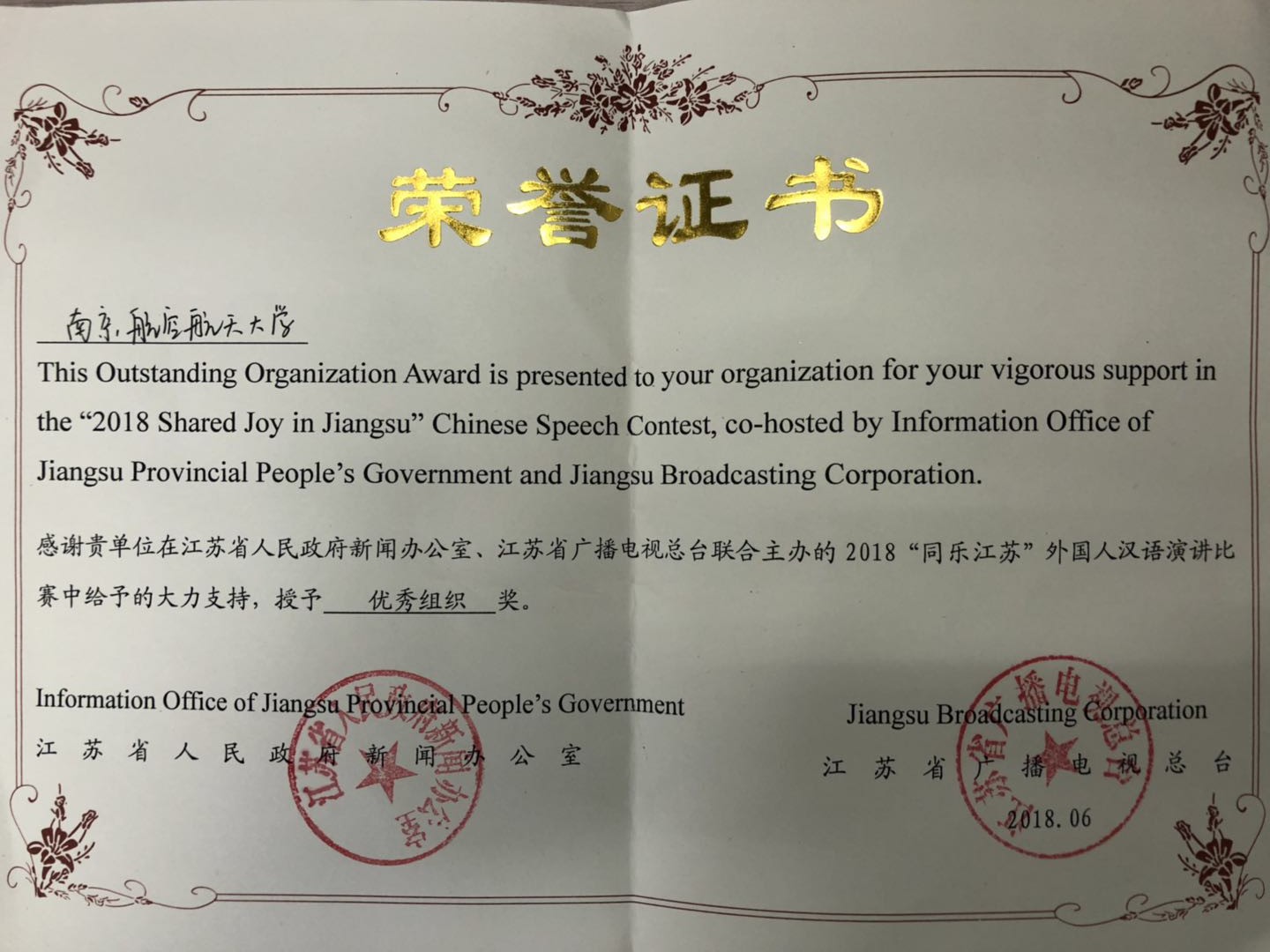 6月20日下午,2018“同乐江苏”外国人汉语演讲比赛总决赛在江苏省广播电视总台演播厅落下帷幕。我校中非籍留学生赫姆斯经过三个比赛环节的角逐,最终获得三等奖的好成绩。同时,由于我校对“同乐江苏”比赛的成功承办以及大力支持,学校也被授予优秀组织奖。