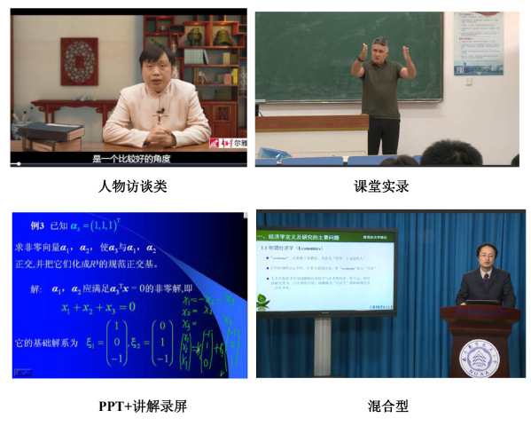 (8)关于录播课程的视频形式,建议如下:① 教学视频通常包括人物访谈类、课堂实录类、录屏类,以及以上混合形式,请各位老师根据各自课程的实际进度自行选择适合的教学视频形式,并按章节上传至教学网站。② 录屏类教学视频的优点是无需专业人员配合、教师可以自由录制,制作效率高。若您的课程之前未曾专门录制过教学视频,建议采用该方式,可以多人分工完成。