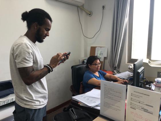 今年的梅雨季节特别漫长,720日上午9点半,雨势依旧不减,将军路校区D32栋留学生宿舍楼里,大二辅导员谷雅雯冒着大雨如约而来,她正在和几名来自非洲埃塞俄比亚的学生耐心解释关于宿舍电费缴纳的问题。工作刚满两年的谷雅雯,是留管战线上的一员新兵,是学生们眼中可亲可敬的“小谷姐姐”。小谷姐姐此刻正被学生们团团围住,“嗯,你的电费应该划款到这里”,“离开宿舍一定要记得关空调呀”,“下雨天记得关好门窗,出门要带雨具”,“暑假期间,进出校门要提前申请”…… 谷雅雯耐心地解答着学生的各种问题,时不时跟学生唠叨两句,细密的汗珠从她的鼻尖渗出。“学生们刚来中国没多久,我是他们的辅导员,也是他们在中国的亲人啊。”小谷姐姐忙碌并快乐着。