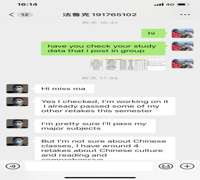 722日下午5点半,乌云压城,暴雨将至。大三辅导员马帅正在245办公室给境外留学生打国际长途。考虑到时差问题,马帅特意等到国外学生起床才拨通电话。电话里马帅鼓励留学生做好个人防护,安排好在线学习任务,并期待在美丽校园的再次相会。线上教学期间,为了督促境外学生完成学业,马帅通过各种方式和学生们逐一联系,社交软件、电子邮件、国际长途……总之,不能落下任何一个孩子。暑假期间她逐一梳理学生学习情况,建立了学业警示表、做了详细的谈话记录,并向学生定期公布学分绩点、年级排名等学习数据,督促学生抓紧学业不放松。
