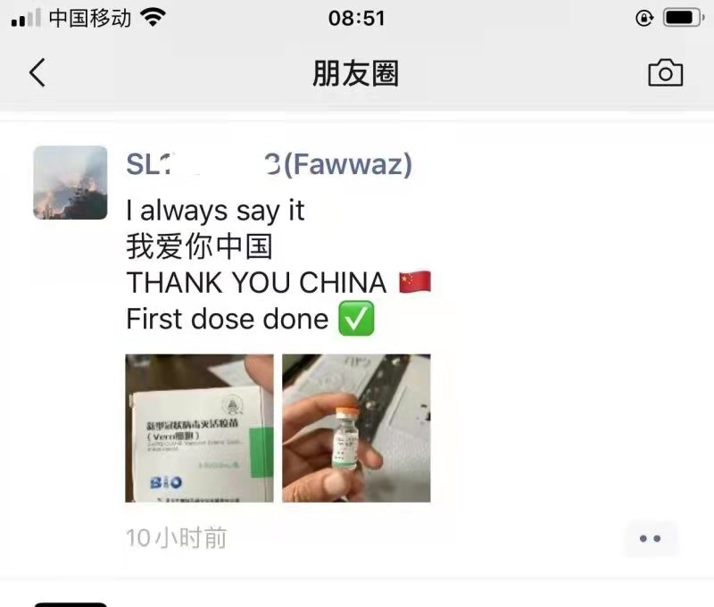 完成疫苗接种的第一时间,法瓦兹就发布了朋友圈。他说:“I always say it我爱你中国, thank you, China。”这次法瓦兹接种的是国药集团中国生物的新冠灭活疫苗。他说接种后感觉很好,也很感激中国的援助。