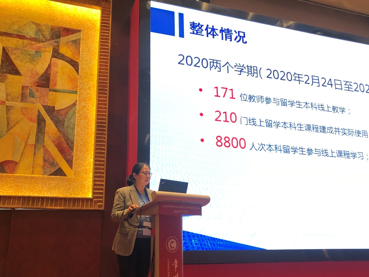 留学生教学办主任刘静在会上做了《凝心聚力、精准谋划,构筑高质量线上教学共同体》的交流发言。