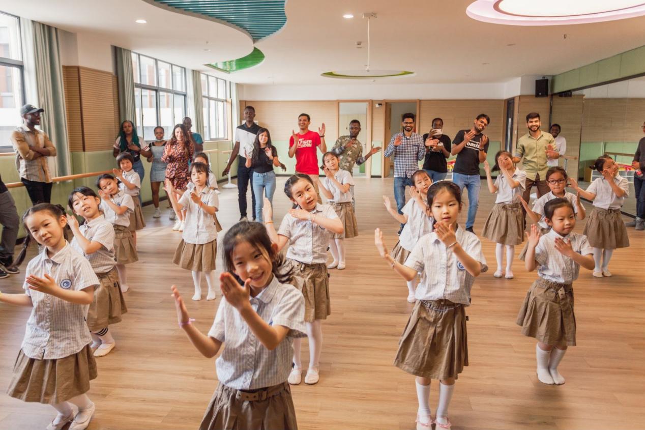 最后,同学们还走进了新都路小学的社团活动课堂,与孩子们进行了丰富多彩、趣味盎然的互动交流。他们一起唱歌、跳舞、跳绳等,对中国的基础教育有了更加直观、真切的认知和体会。留学生们参与到小学生乐器、歌舞、书法、读书等活动内容,加深了对中国艺术的了解,对中国文化的认识和兴趣。