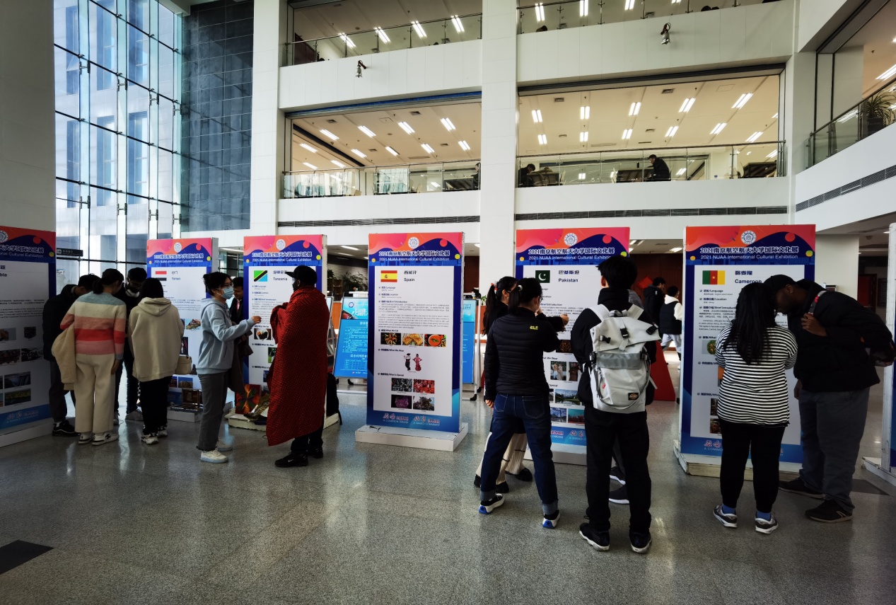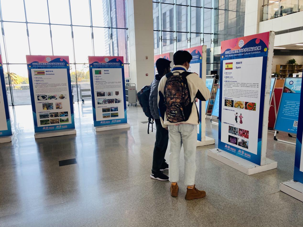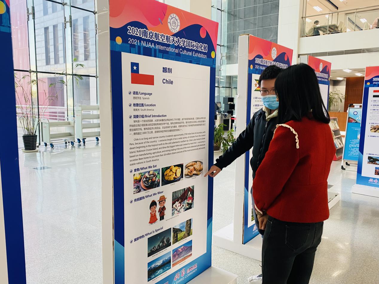 近日,我校“领略异域风采,共享多元文化----2021国际文化展”分别在将军路校区图书馆二楼大厅与天目湖校区南山苑餐厅广场前成功举行。喀麦隆、智利、西班牙、哥斯达黎加等15个国家参加此次展出,丰富的国际文化知识和多彩的异域风采图片吸引了众多师生驻足观看。
