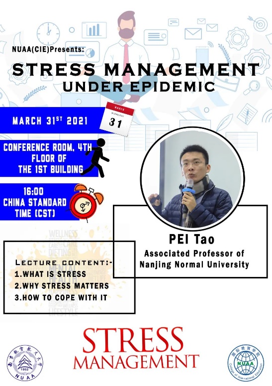Stress‐related conditions and outcomes are prominent among the mental health issues which has taken the centre stage during COVID-19 pandemic. To help the students cope better with stress, College of International Education of NUAA is going to arrange a seminar on Stress Management Under Epidemic.