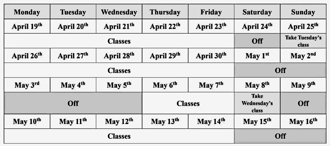On 25th April (Sunday), there will be classes for 4th May (Week 10, Tuesday). On 8th May (Saturday), there will be classes for 5th May (Week 10, Wednesday). Please refer to following table for better understanding.