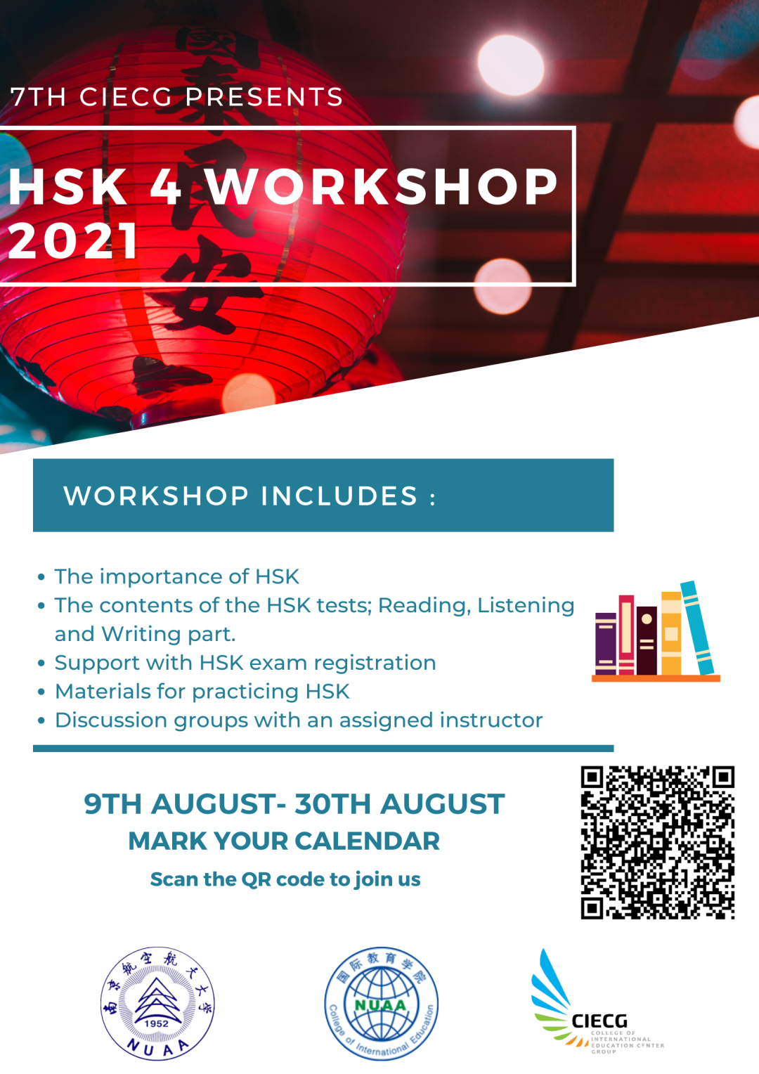 As the world becomes more interconnected and interdependent, proficiency in other languages has become an essential skill to communicate effectively with the rest of the world. Passing HSK enables us to connect with the Chinese people, their culture, history, literature, and a lot more. As a result, preparing for this exam will allow a student to cover a wide range of useful material which will be immediately applicable in various situations. Passing HSK examinations with good scores shows one has the linguistic aptitude. Students' chances of receiving a Chinese scholarship will improve as well. With the guidance of teachers from CIE, the workshop will be conducted by CIECG members who have already finished HSK-4 or are proficient in Chinese. CIECG aims to encourage students to take HSK examinations and accomplish something worthwhile even if they are at home.