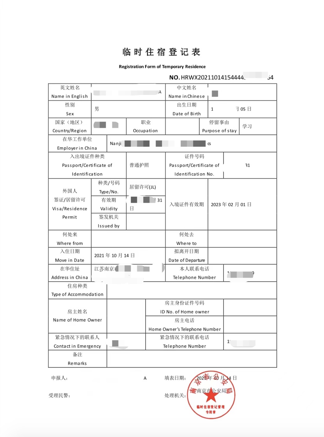 4)学校将统一协助新生到南京市公安局出入境办证服务中心申请居留许可。