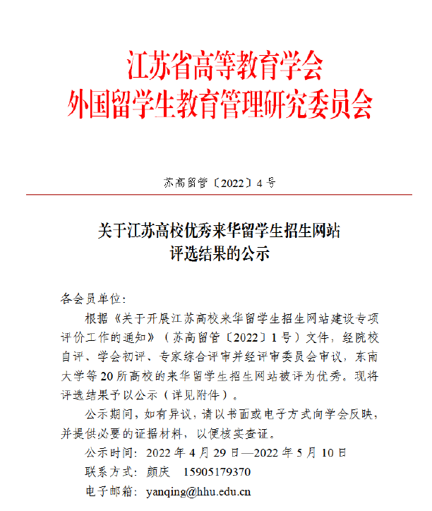 近日,江苏省高等教育学会外国留学生教育管理研究委员会正式公布了江苏高校优秀来华留学生招生网站评选结果,我校BW·西汉姆联主持建设的来华留学生招生网站被评为“江苏高校优秀来华留学生招生网站”。根据《关于开展江苏高校来华留学生招生网站建设专项评价工作的通知》(苏高留管【2022】1号)文件,该评选活动历经院校自评、学会初评、专家综合评审及评审委员会审议等环节,最终全省有20所高校的来华留学生招生网站被为优秀。