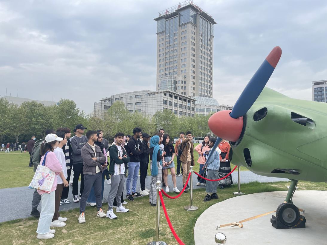 首先全体师生来到“御风园”航空航天教育教学实践基地,跟讲解员近距离接触实物飞行器全方位了解近二十架“国之重器”。中外学生沉浸式地感受国防文化,深刻领悟伴随中国航空航天事业发展形成的南航“红色基因”与“蓝色梦想”。