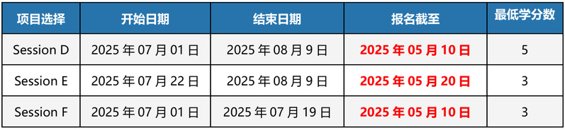各个Session开设的课程有所区别。其中Session D主要开设各个学科的专业课程,需要学生具备一定的英语语言能力,部分课程要求学生有特定的专业或前置课程背景。Session E/F除部分学科的专业课程外,大量开设英语语言强化类课程,若学生仅选择修读语言强化类课程,在项目申请时可免除语言要求。
