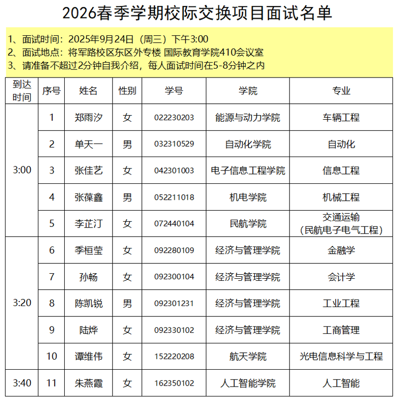 欢迎大家参加2026春季学期校际交换项目面试。面试选拔将本着“公平、公正、公开”的原则,主要考查学生GPA、外语成绩及综合素质等,并且结合学生填报的志愿、课程匹配性和是否服从分配进行综合考量。面试具体通知如下: