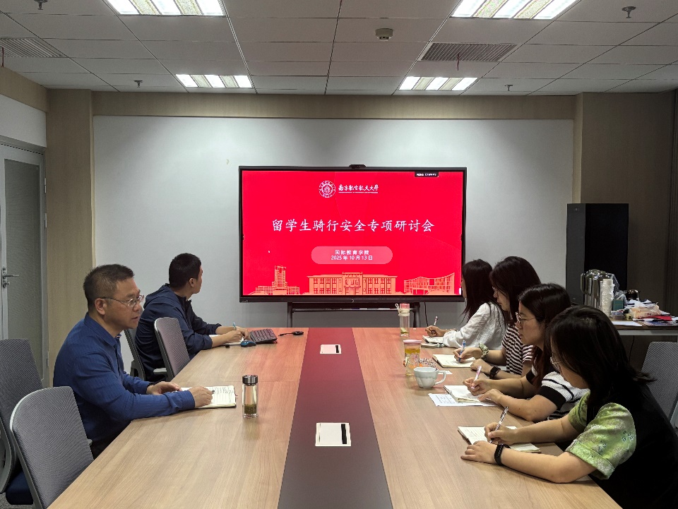 1013日下午,学院召开“留学生骑行安全专项研讨会”。会议由院长刘长江主持,留学生管理办公室全体人员参加。会议聚焦当前校园内学生骑行电动自行车中存在的违规载人、逆行等安全隐患,深入分析其危险性,并就如何有效开展整治达成共识。