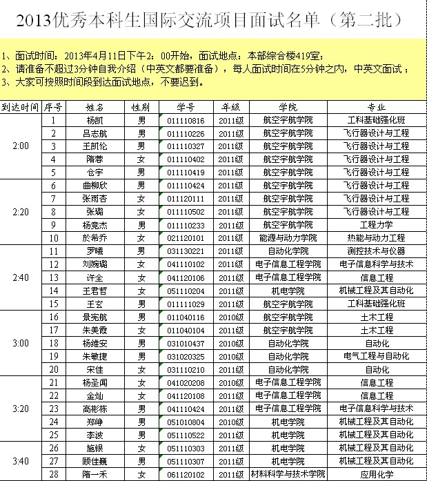 2013优秀本科生国际交流项目面试名单(第二批)