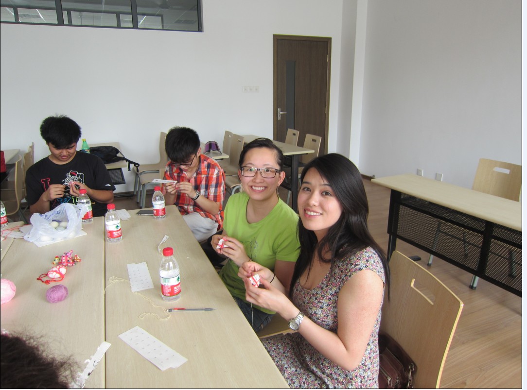 对于留学生来说,这算是他们做手工粽子的处女作了。这过程中他们也表现出对中国文化的极大的兴趣。中外学生边聊天边制作手工,没有拘谨,没有生疏,有的只有亲切和友好。来自加拿大的许维婷表现出很高的手工悟性,做得又快又好,当她做出网袋放咸鸭蛋时,一个中国学生开玩笑说可以拿它去网鱼啦!大家哄堂大笑,课堂呈现出一片欢乐融洽温暖的情景。