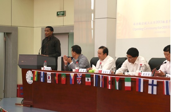 典礼开始,与会人员与2013级留学生一同观看了我校英文宣传片。随后在校留学生代表李雨泽和新生代表兰加特分别发表了感言。李雨泽同学作为南航本科毕业,并继续攻读硕士学位的在校留学生,从他在南航的学习生活经历出发,给予新来的学弟学妹们诸多实用而有意义的建议。新生代表兰加特则从学习汉语的经历出发,表达了对中国的热爱以及对加入到南航大家庭的激动和欣喜。他们的发言幽默而生动,赢得了参会来宾的阵阵欢笑和掌声。