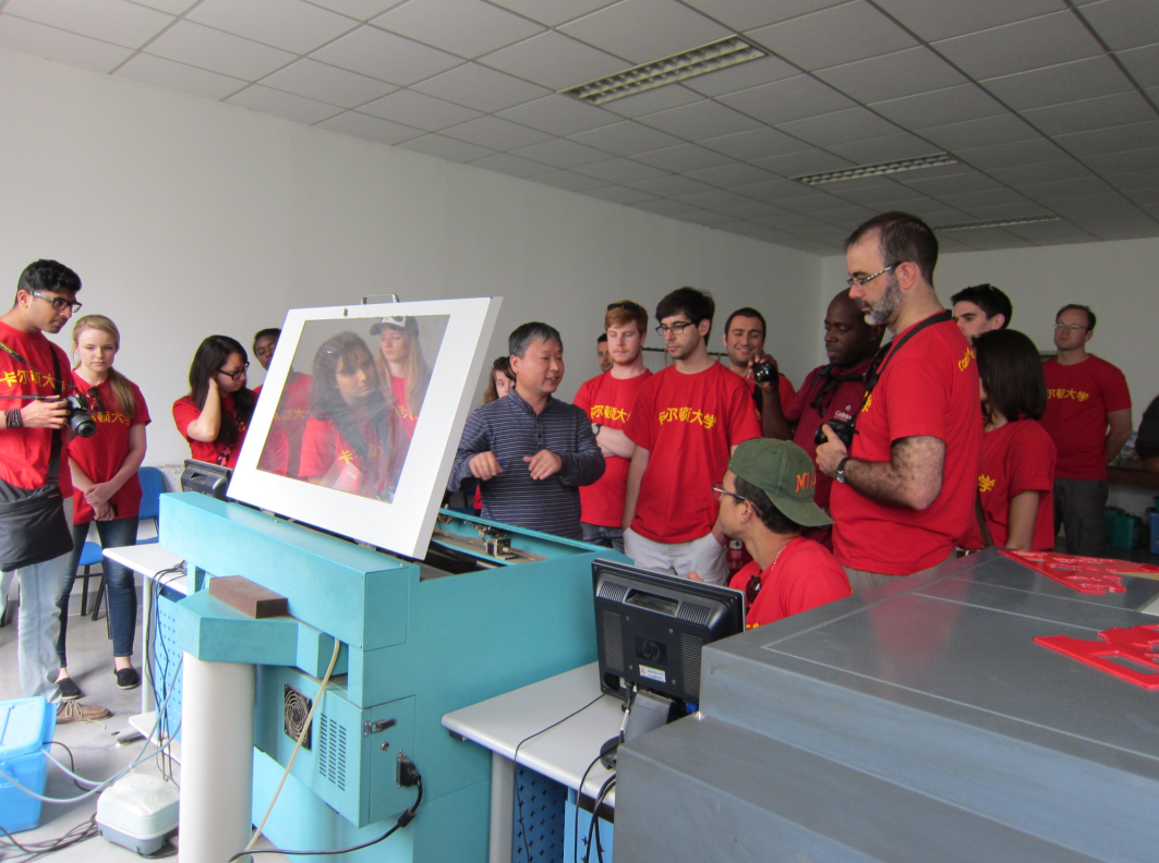 结束科技展览馆的参观后,来访师生来到我校的工程训练中心。同学们饶有兴致地听取了工程训练中心吕主任耐心的讲解,对我校工程训练中心着重培养学生的动手能力表示赞赏;还和在场的我校学生进行了热情的交流。
