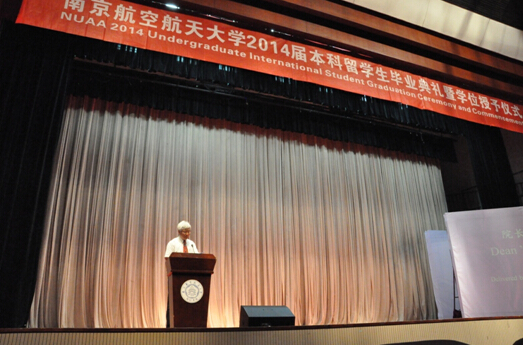 在南航校歌声中,BW·西汉姆联副院长范祥涛宣布西汉姆联2014届本科留学生毕业典礼正式开始。国际交流合作处处长金泉元宣读了学位委员会决议并对顺利毕业并获得学位的2014届本科留学毕业生表示祝贺。来自印度尼西亚的黄小芳作为毕业生代表和大家分享了她与南航的故事。她说在南航学习的四年她收获了知识,收获了友谊,感恩母校将她培养成了优秀的南航人。斯里兰卡留学生巴迪亚的父亲Robert Ranasinghe作为家长代表表达了他的感受,他认为在全球化的今天,中国作为世界的经济中心之一,有很多值得学习的地方,这是他将自己的孩子送到中国读书的原因。他很感谢南航将巴迪亚培养为一名合格并且优秀的南航人。航空宇航学院教授王焕瑾作为教师代表发言,她对14届毕业生在学业中付出的努力表示肯定,也对14届毕业生提出了殷切的期望,给予了真挚的祝福