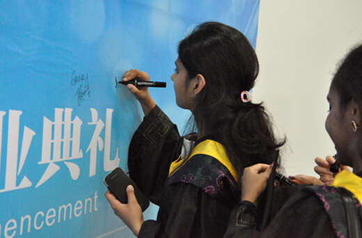 典礼在以“飞得更高”为主题的视频中拉开了序幕,视频讲述了2014届留学毕业生在南航四年生活的点点滴滴,精心挑选出的上百张充满回忆的老照片让学生们重温了丰富多彩的校园生活,这份毕业的影像不仅寄托了母校对留学生的思念,也激励他们在未来的日子里飞得更高,飞得更远。