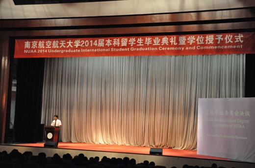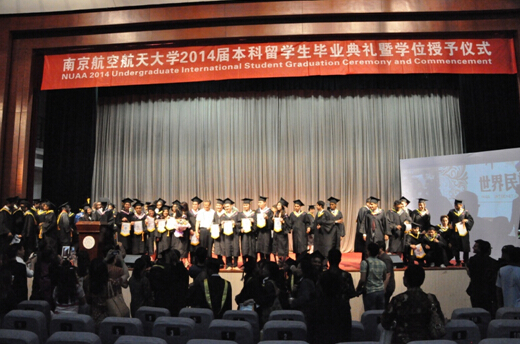 典礼之后是隆重庄严的学位授予仪式。学校领导,各学院领导和教师代表为在场的108位毕业生一一扶正流苏并颁发学位和校旗。108位毕业生依次上台接受学位和校旗并和领导合影留念。毕业典礼暨学位授予仪式在学生们的欢呼声中圆满结束。不久,他们中的很多人就要踏上回国的征程,四年的南航求学生涯至此画上句点,但这同样是他们精彩人生的起点,祝愿2014届留学生能在南航学到的知识,奉献社会、成就自我,在世界上的各个地方,绽放自己的理想之花,做一名让母校骄傲的南航人。