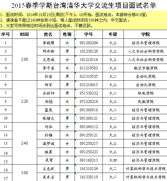 2015春季学期台湾清华大学交流生项目面试名单