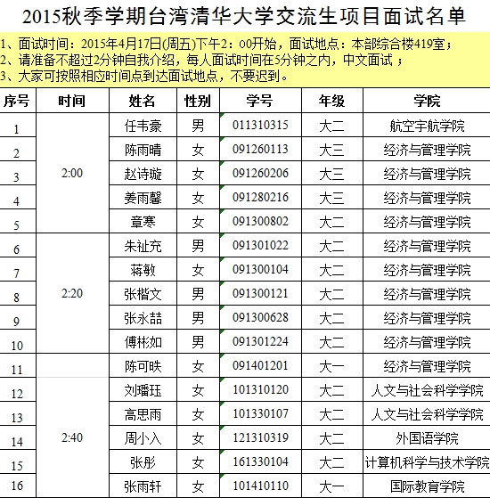 首先欢迎各位同学参加2015秋季学期台湾清华大学交流项目面试。面试选拔将本着“公平、公正、公开”的原则,主要考查学生GPA、综合素质等。