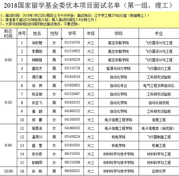 首先欢迎各位同学参加2018国家留学基金委优秀本科生国际交流项目(第一批)选拔面试。面试选拔将本着“公平、公正、公开”的原则,主要考查学生GPA、外语成绩及综合素质等,并且结合学生填报的志愿和是否服从分配进行综合考量。面试具体通知如下: