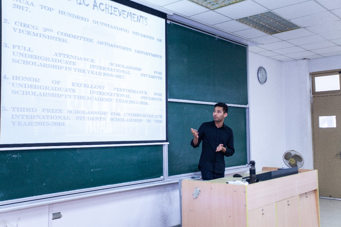 在近两小时的展示中,2018届优秀留学生候选人从各个方面讲述了自己在南航,在中国学习和生活的优秀事迹和突出成绩,体现了我校来华留学生们在本科学习阶段的学术和文体活动多方面发展的不俗成果,获得了在场的老师和同学们的一致赞许和掌声。此外,很多候选人还给在场的学弟学妹们提出了一些关于学习专业知识,中国文化,以及实习就业方面的各类建议,让他们对于自己现阶段的学习生活以及未来的职业规划发展都有了新的看法和启迪。最后,每一位毕业生都对南航以及老师们表达了自己深深的依恋和感恩,是南航严谨治学的精神让他们一步步成长,是老师们的耐心与帮助让他们成就现在的自我,在未来的发展中,他们都会时刻牢记自己是南航的一份子,他们会继续奋斗,将南航精神传递出去。