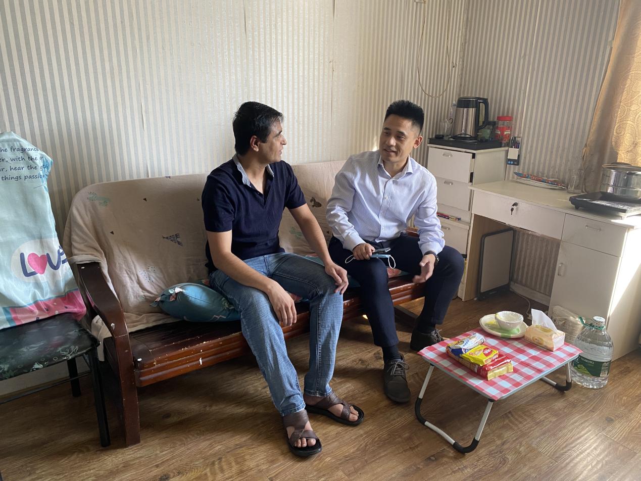 在巴基斯坦博士生柯索家中,陈峰详细询问柯索的科研、生活情况及存在的困难,在得知柯索已发表4篇高水平期刊论文后,陈峰对此表示肯定,并鼓励他在做好疫情防护前提下,专注毕业论文,以优异成绩完成博士阶段学习;柯索感谢学校无微不至的关心,表示会继续潜心科研,创造更多的学术成果。