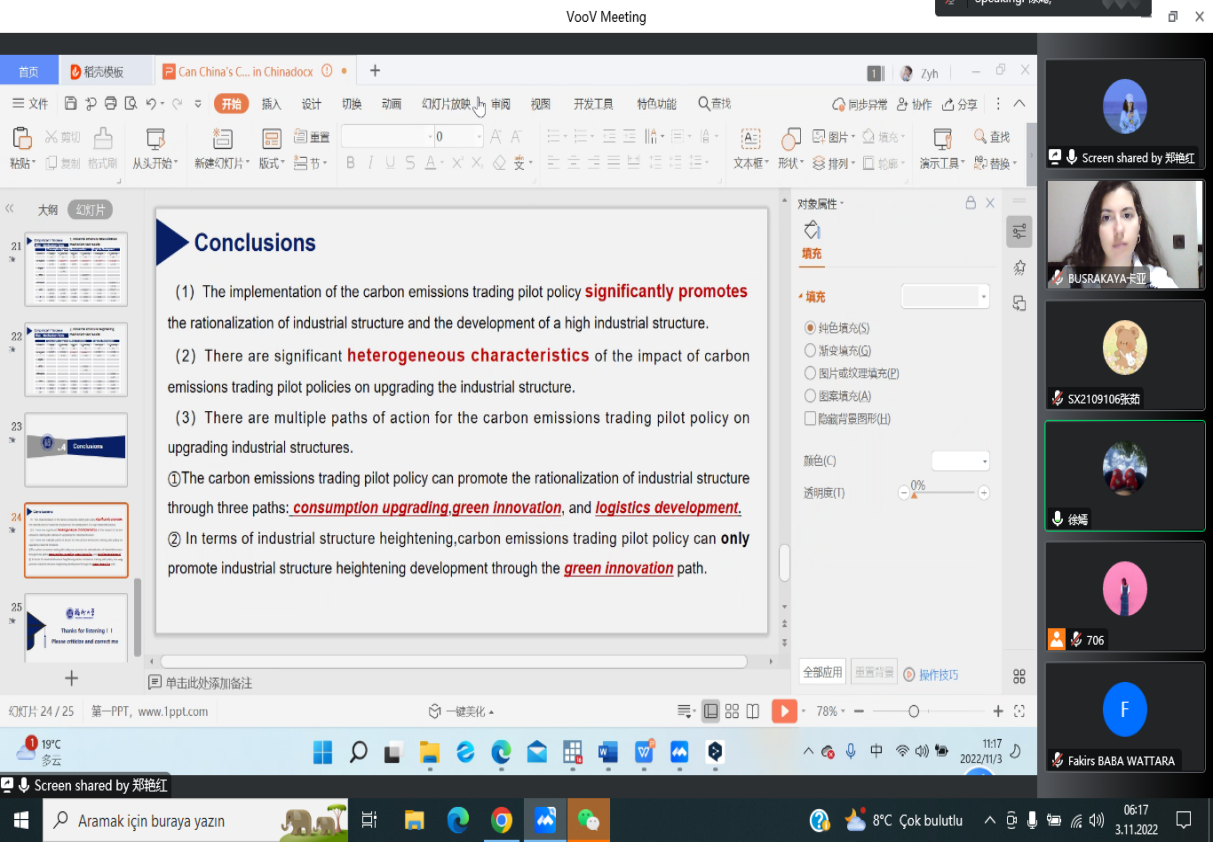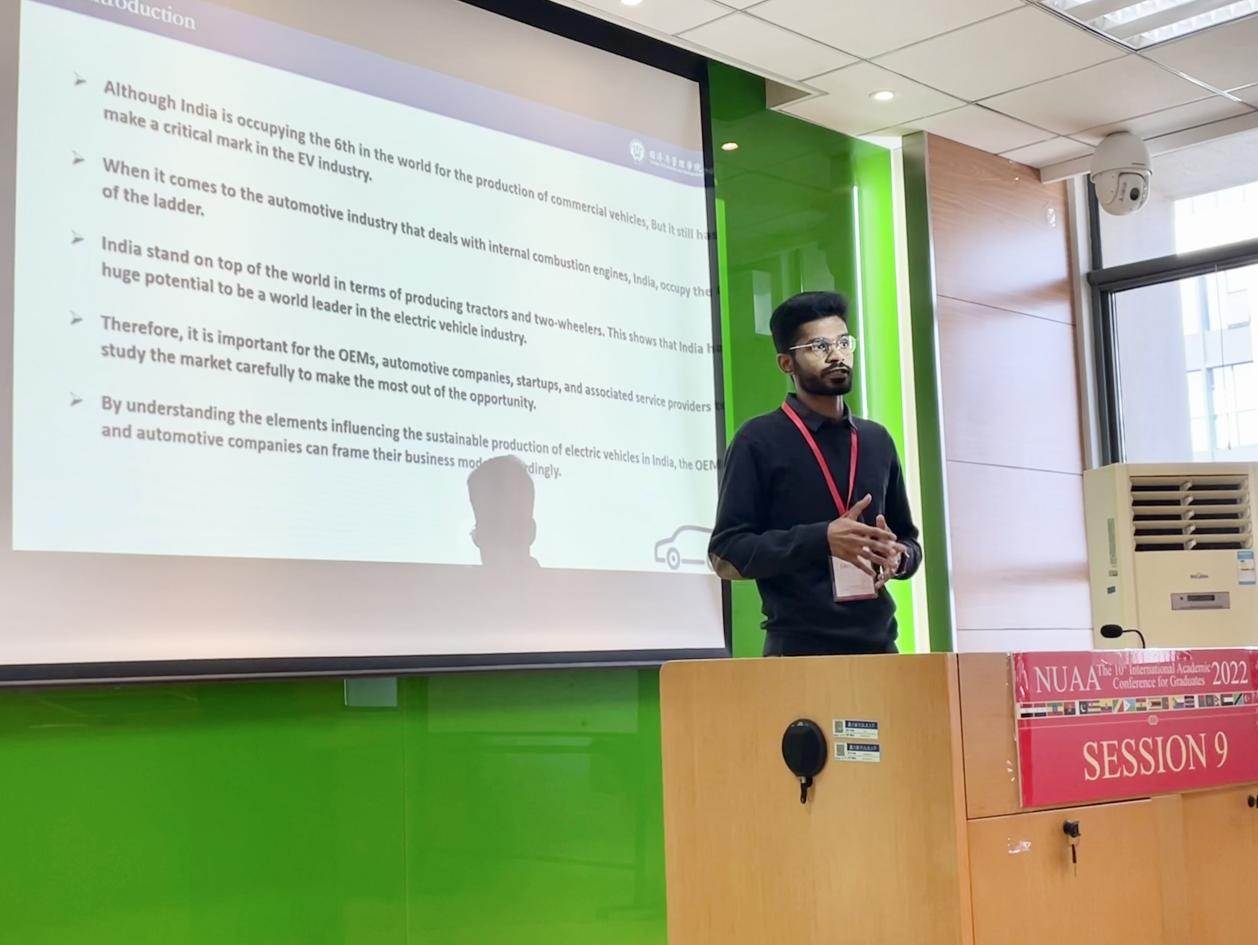 在“管理科学与工程”分论坛上,巴基斯坦籍硕士生乌玛作了题为“Assessment of Elements for Sustainable Production of Electric Vehicles in the Indian EV Industry的报告,围绕“电动汽车可持续发展要素”话题分享研究成果。中外师生开展讨论与交流,现场气氛热烈。乌玛的报告受到在场评审专家和师生的一致肯定,获得“优秀论文奖”。